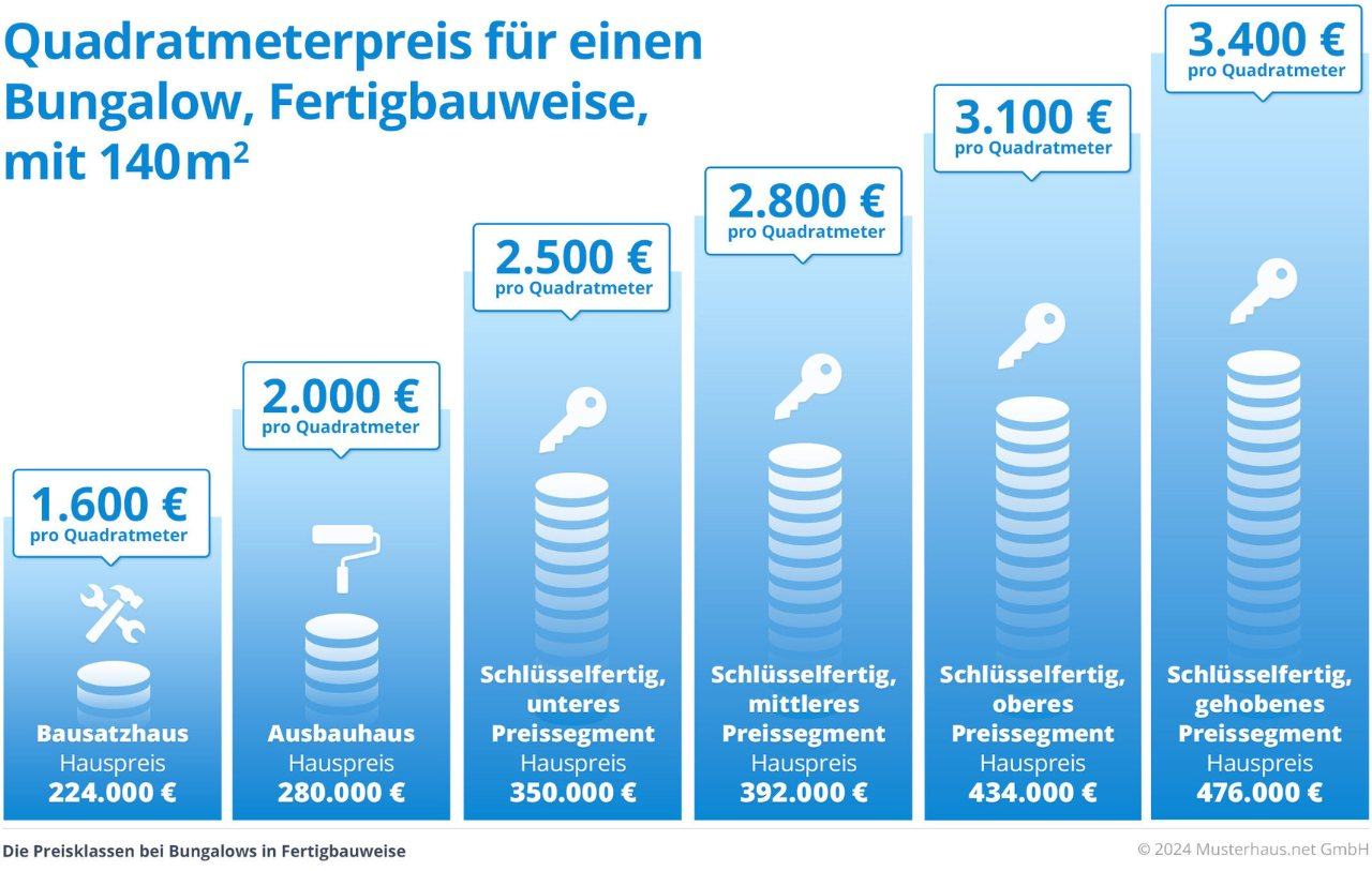 Ein schlüsselfertiger Fertighaus-Bungalow kostet in 2025 etwa 200.000 und 476.000 €. Das entspricht 2.500 bis 3.400 € pro Quadratmeter. Diese Preise gelten für ein schlüsselfertiges Haus ohne Keller, jedoch inklusive Bodenplatte. Bitte beachten Sie, dass zusätzliche Kosten für das Grundstück, Baunebenkosten und Außenanlagen hinzukommen.