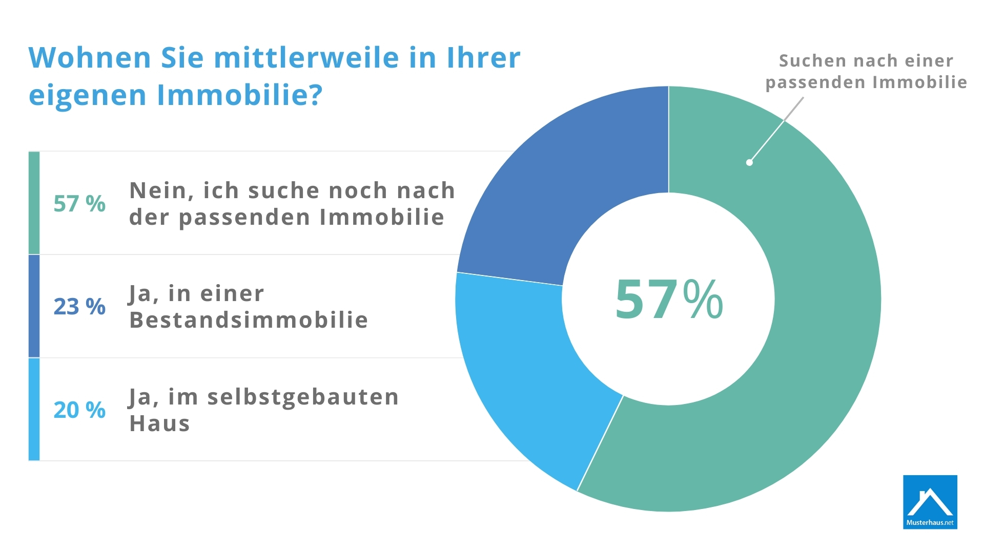 Nur 43 Prozent der Befragten, die in den Jahren 2022/23 mit Musterhaus.net in Kontakt getreten sind, sind mittlerweile tatsächlich in ihr neues Eigenheim umgezogen. Die eine Hälfte dieser happy few wohnt im selbstgebauten Haus (20 Prozent der Befragten), die andere Hälfte (23 Prozent) in einer Bestandsimmobilie. Für 57 Prozent geht die Suche weiter: Sie haben noch nicht die richtige Immobilie gefunden.