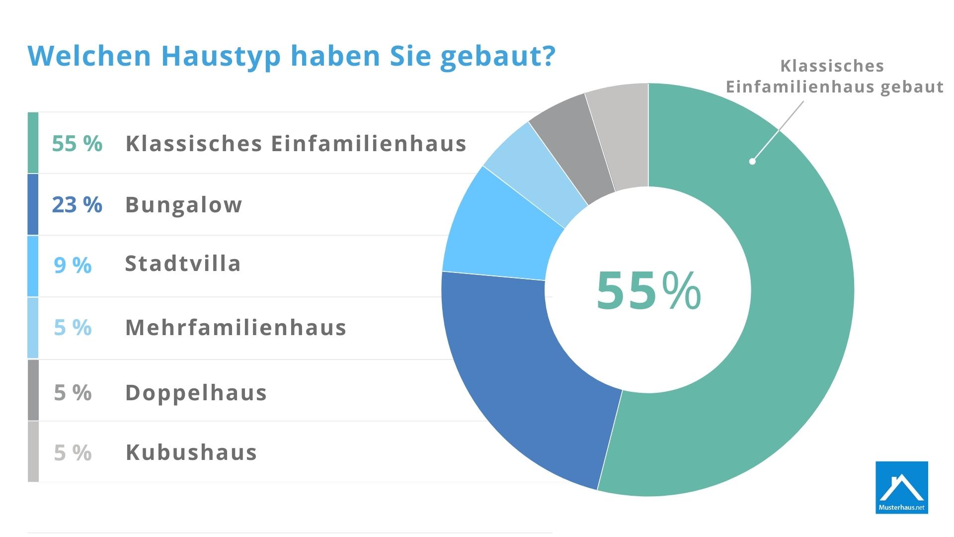 Welcher Haustyp sind Sie? Das wollte Musterhaus.net von den frischgebackenen Bauherren wissen. Ergebnis: Mit 55 Prozent setzen die meisten auf das klassische Einfamilienhaus. Jeder Vierte (23 Prozent) ist hingegen stolzer Besitzer eines Bungalows. Damit hat die eingeschossige Bauweise deutlich an Beliebtheit gewonnen, denn bei der letzten Bauherrenumfrage von 2024 haben sich nur 16 Prozent der Häuslebauer für diesen Haustyp entschieden. Weniger en vogue ist aktuell die Stadtvilla: Nur 9 Prozent sind in eine solche Immobilie eingezogen – vor einem Jahr waren es noch 15 Prozent. Noch seltener sind die neuen Bauherren in Mehrfamilien-, Doppel- oder Kubushäusern anzutreffen – nur jeweils 5 Prozent der Befragten haben sich für eine entsprechende Immobilie entschieden.