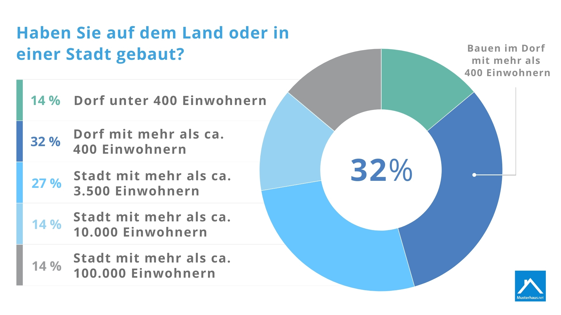 Ein Grund für die schrumpfende Wohnfläche könnte der Ruf der Großstadt sein. So geben 14 Prozent der Bauherren von 2025 zu Protokoll, ihr Eigenheim in einer Metropole mit mehr als 100.000 Einwohnern errichtet zu haben – bei der Befragung vor einem Jahr waren es nur halb so viele (7 Prozent), die sich in einem solchen Ballungsraum niedergelassen haben. Nach wie vor entstehen aber die meisten Neubauprojekte in Dörfern mit mehr als 400 Einwohnern: Jeder dritte Bauherr ist hier heimisch geworden – auch wenn das weniger als im Vorjahr sind (39 Prozent), bleiben Dörfer damit weiterhin im Trend.