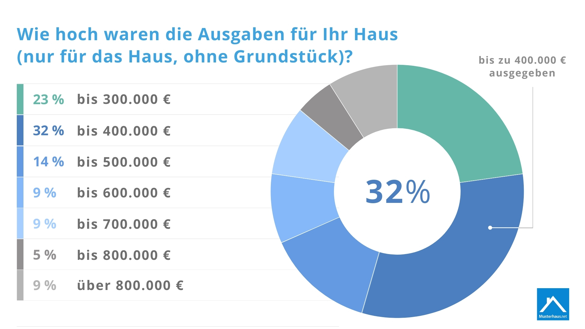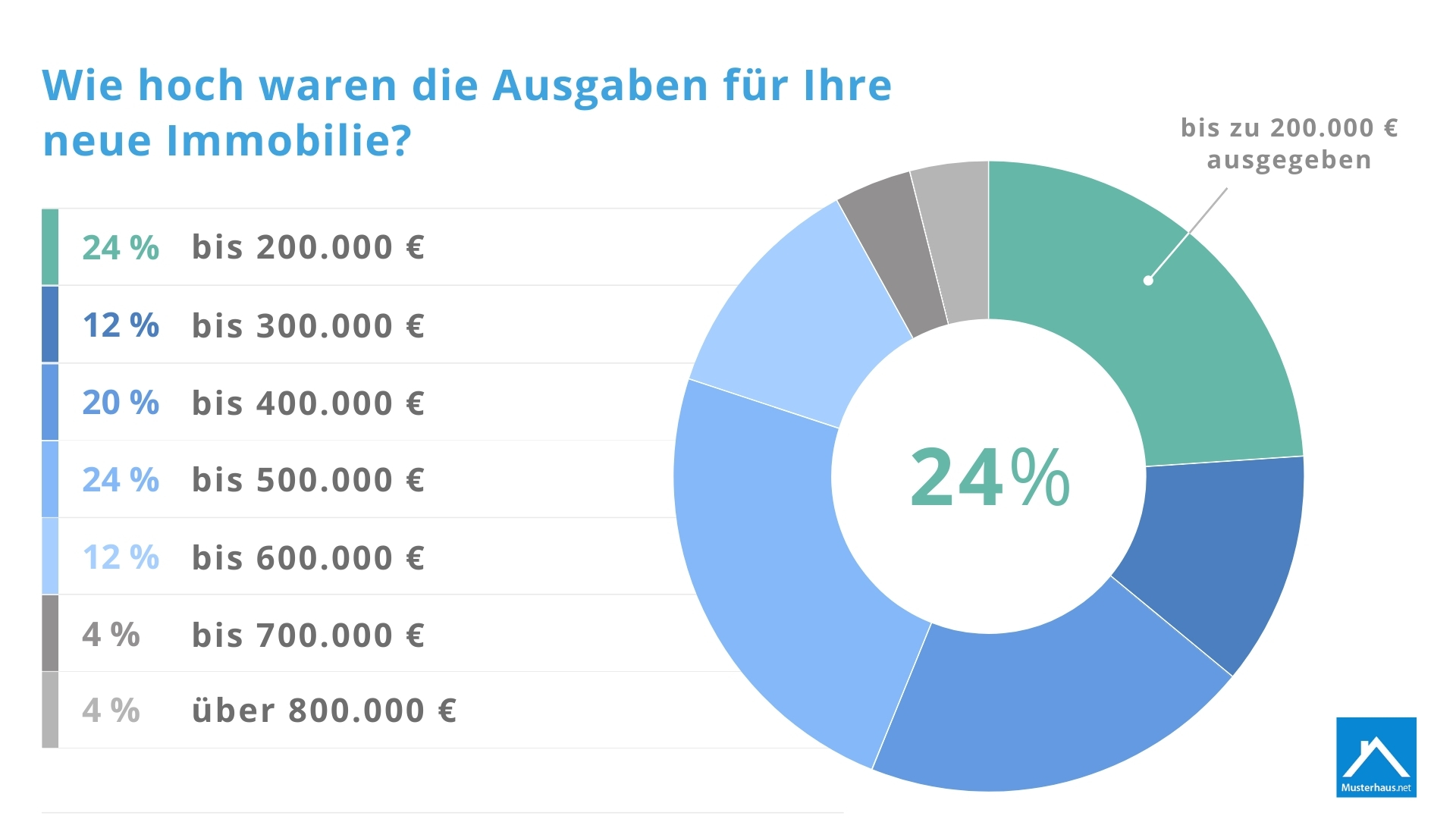 Neuware ist kostspieliger als Gebrauchtes – das gilt auch im Immobiliengeschäft. So fallen Investments für den Hausbau im Schnitt deutlich höher aus als für Bestandsimmobilien. Besonders deutlich wird das im hochpreisigen Segment. So steckt fast jeder zehnte Bauherr über 800.000 Euro in die Errichtung seines neuen Domizils, aber nur 4 Prozent der Eigenheimkäufer erwerben eine Immobilie in dieser Preisrange. Die Mehrheit rechnet allerdings mit kleineren Summen. So investieren 55 Prozent der Bauherren lediglich bis zu 400.000 Euro in ihr neues Eigenheim. Erstaunlicherweise ist das exakt die Summe, die auch 56 Prozent der Käufer in ihre Immobilie stecken. Ist Neues also doch nicht grundsätzlich teuer als Gebrauchtes? Doch ist es, denn die Häuslebauer müssen ja auch noch das Grundstück finanzieren.