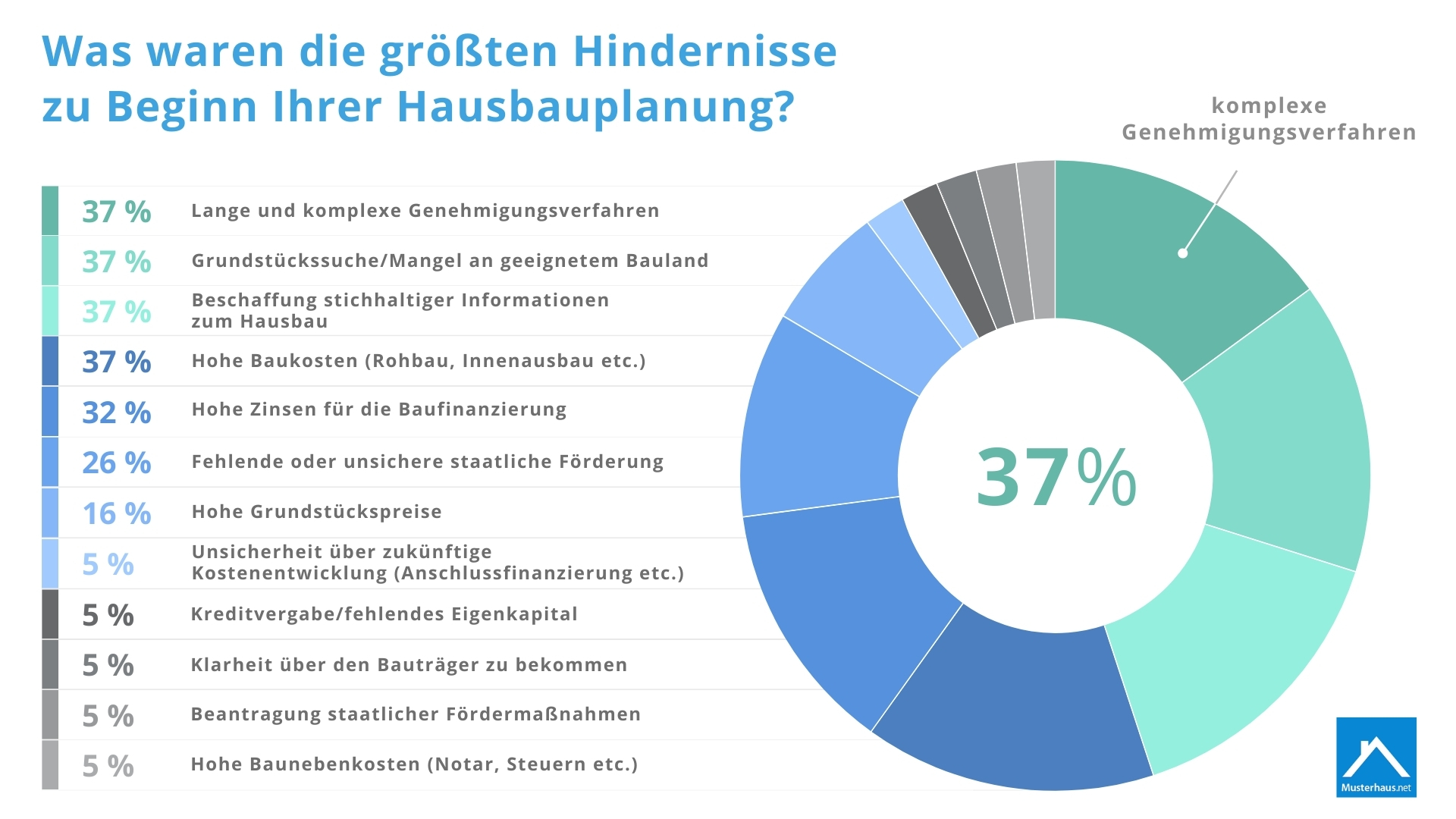 Die eigenen Träume verwirklicht man selten im Vorübergehen – das gilt umso mehr für diejenigen, die sich hierzulande nach einem eigenen Haus sehnen. Besonders fordernd sind dabei: Lange und komplexe Genehmigungsverfahren, Grundstückssuche/Mangel an geeignetem Bauland, Beschaffung stichhaltiger Informationen zum Hausbau und die hohen Baukosten (Rohbau, Innenausbau etc.) – jeweils 37 Prozent der Befragten sehen hier die größten Hindernisse beim Projekt Eigenheim. Aber auch die hohen Bauzinsen bereiten jedem Dritten ernstzunehmende Schwierigkeiten. 26 Prozent zählen im Rückblick zudem eine fehlende oder unsichere staatliche Förderung zu den größten Hürden auf dem Weg in die eigenen vier Wände.