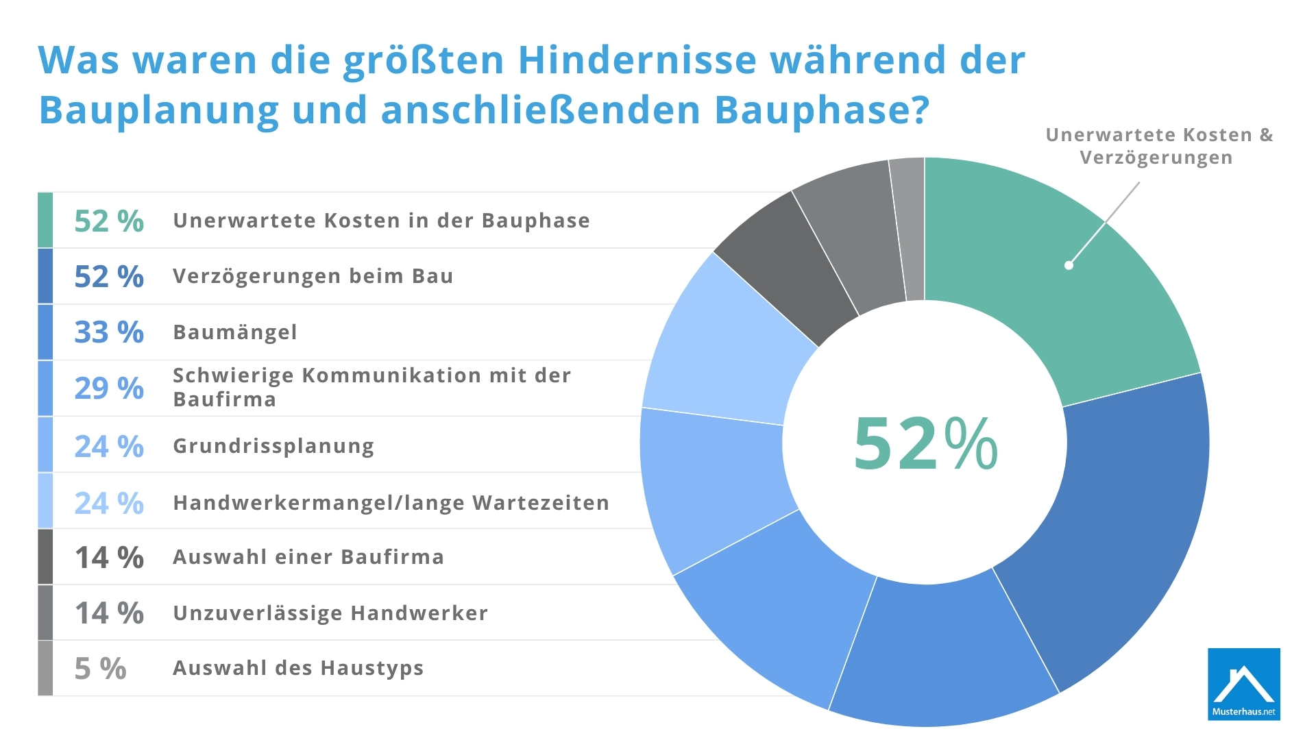 Haben die Häuslebauer die undankbare Zeit der ersten Planungen überwunden, stehen auch schon die Herausforderungen der Bauphase an. Hier sind es zuallererst die unerwarteten Kosten und die Verzögerungen beim Bau, die jeden Zweiten an die eigenen Grenzen bringt. Und während ein Drittel das Thema Baumängel belastet, sind es für 29 Prozent Kommunikationsprobleme mit der Baufirma. Ein Viertel der Umfrageteilnehmer aus der Gruppe der frischgebackenen Hausherren erinnert sich zudem an Schwierigkeiten, die sich aus dem Handwerkermangel ergeben haben.